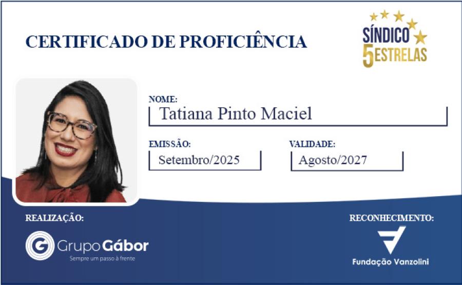 Além da gestão condominial, Tatiana também é professora em cursos de formação de síndicos, contribuindo para a qualificação de novos profissionais e para o fortalecimento do setor.